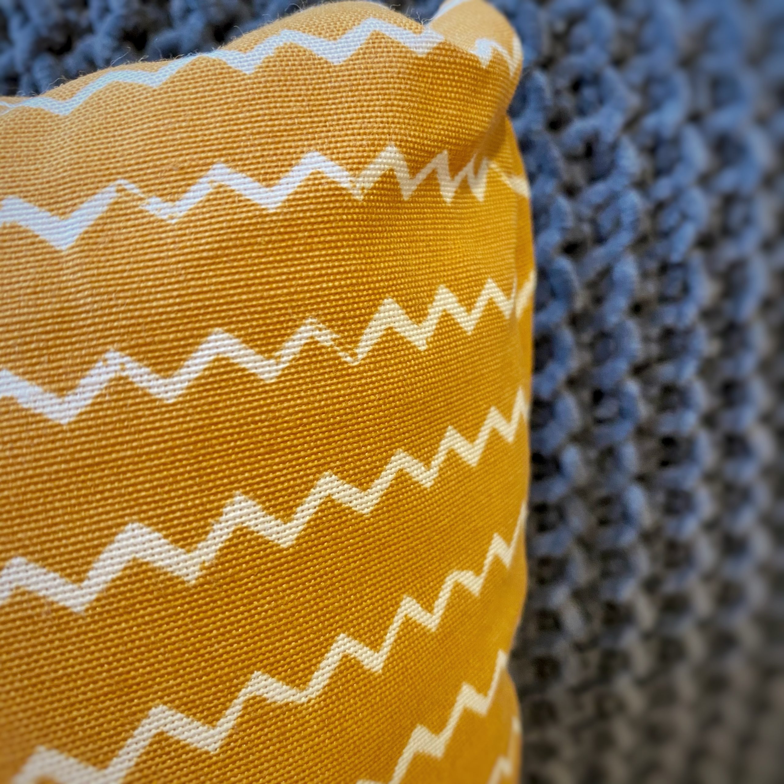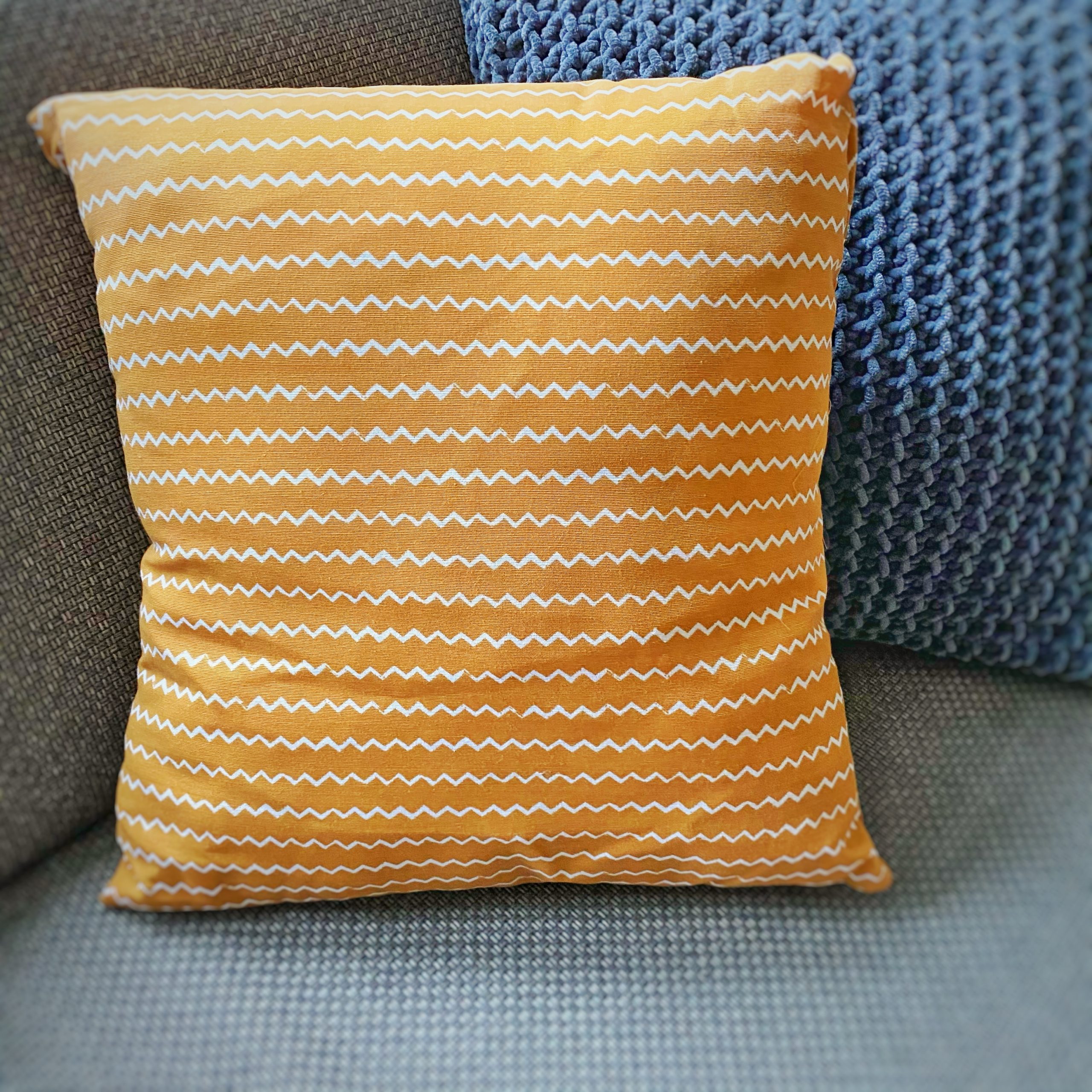 Vrolijk kussen voor in huis. De warme gele kleur met zig-zag patroon maakt het een eyecatcher op je bank of bed. Gemaakt door onze medewerkers in de dagbesteding.